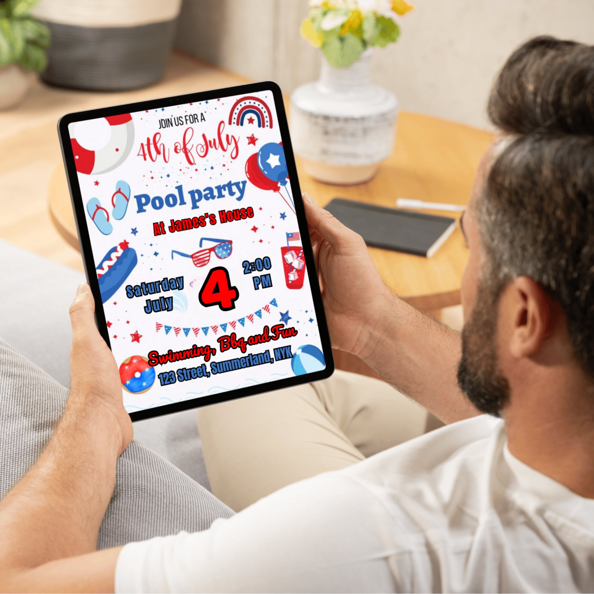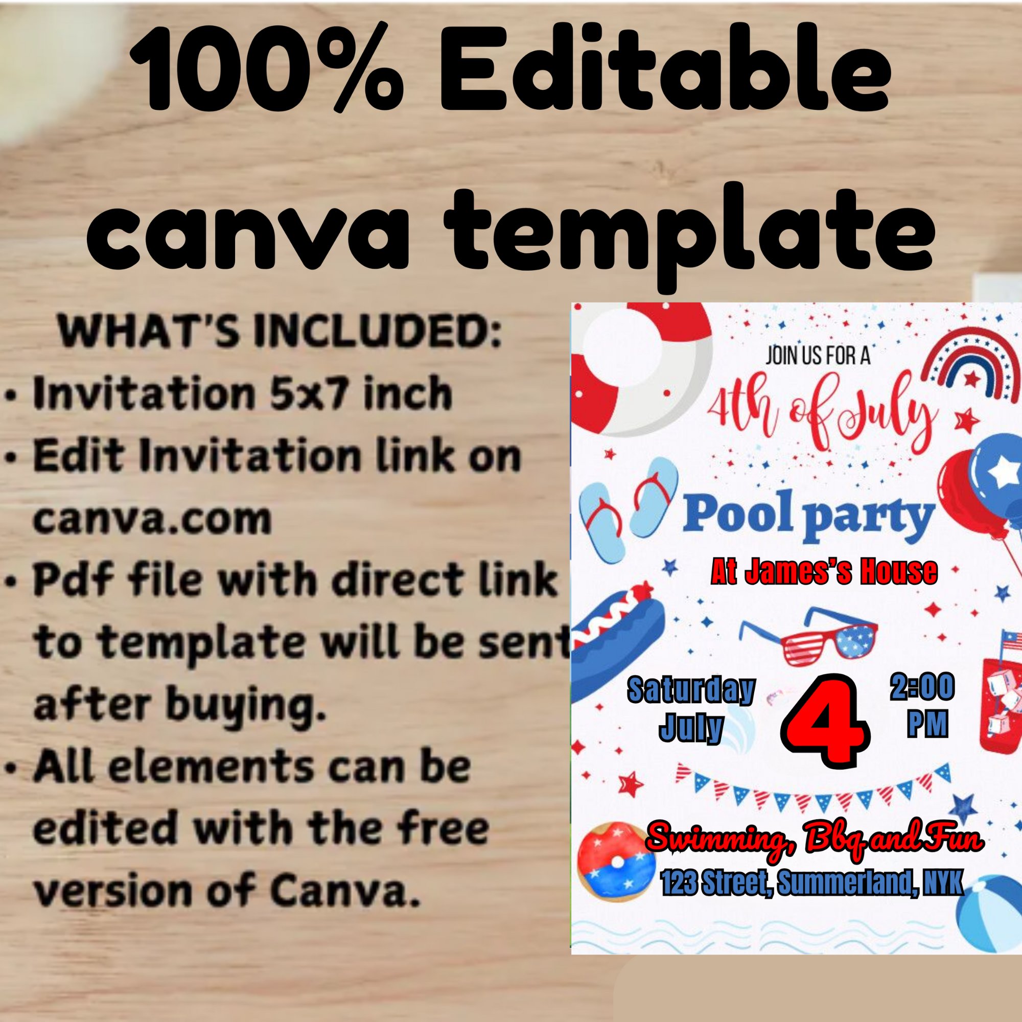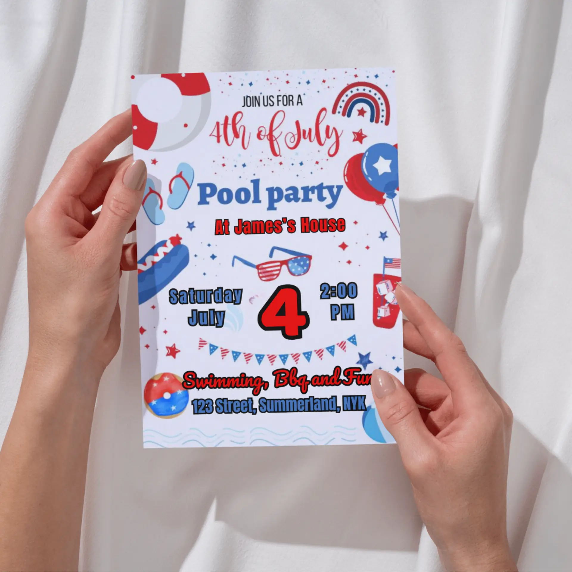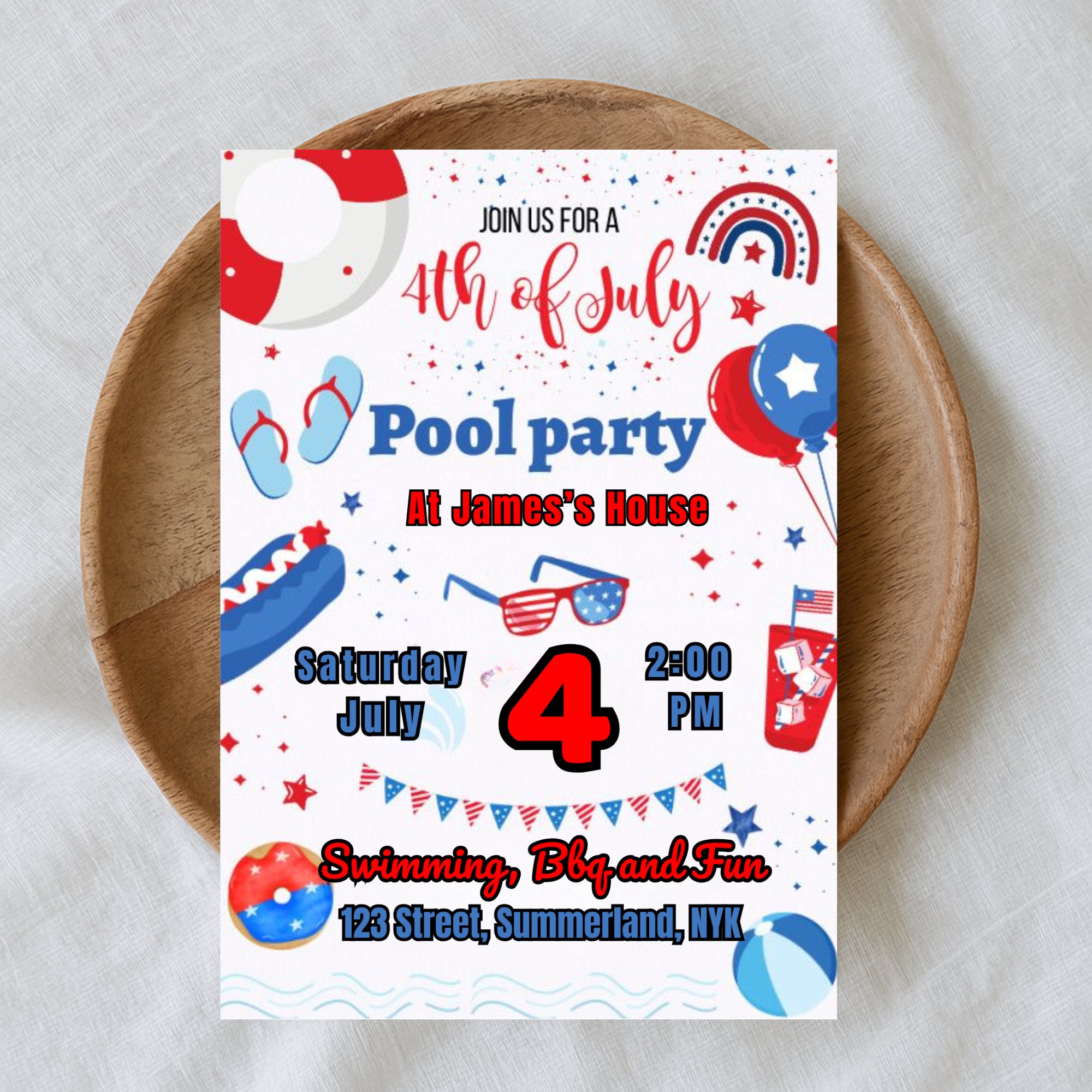 4th of July Pool Party Invite, BBQ Summer Invitation, Editable Canva Template, Patriotic Birthday Card, Instant Download